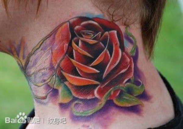脖子处精美漂亮的玫瑰花纹身图案_玫瑰花纹身图案大全_纹身图吧