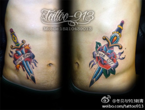 男生腹部经典潮流的匕首玫瑰花纹身图案_玫瑰花纹身图案大全_纹身图吧