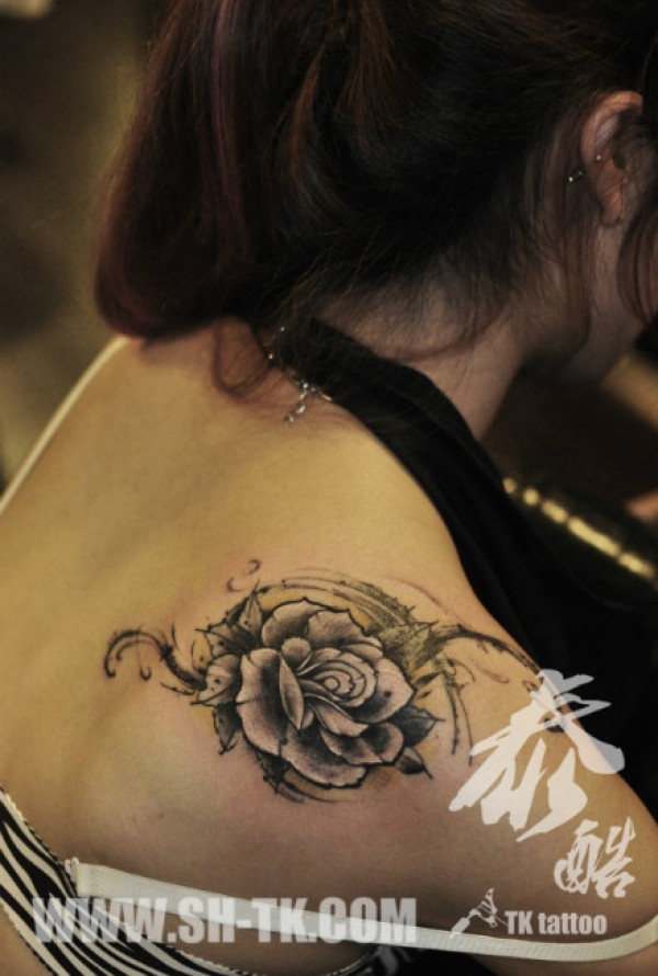女生肩膀处漂亮时尚的黑灰玫瑰花纹身图案_玫瑰花纹身图案大全_纹身图吧