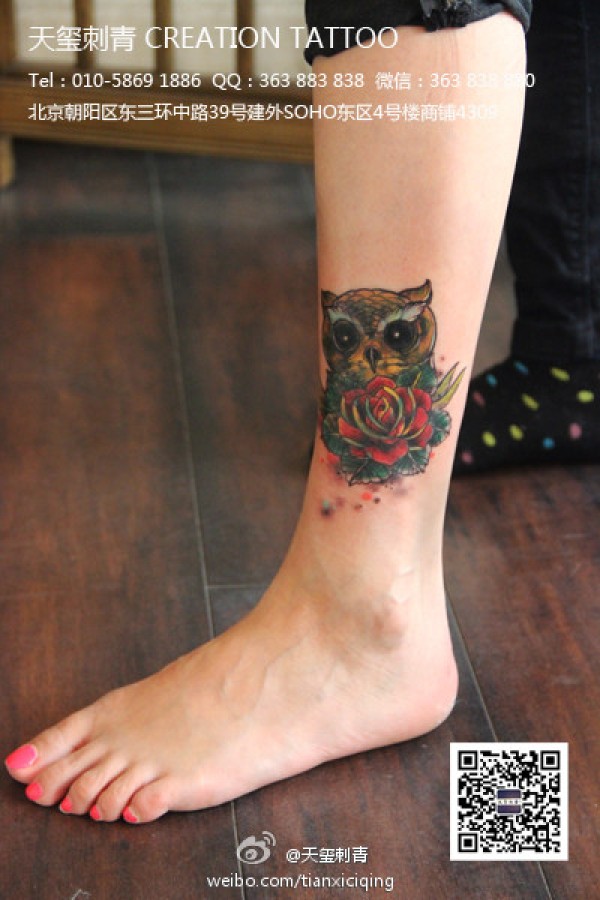 女生腿部潮流的猫头鹰与玫瑰花纹身图案_玫瑰花纹身图案大全_纹身图吧