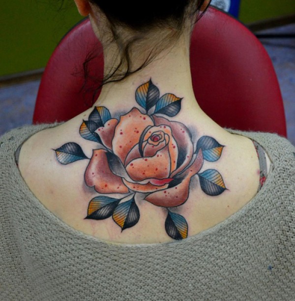 女生颈部好看唯美的彩色玫瑰花纹身图案_玫瑰花纹身图案大全_纹身图吧