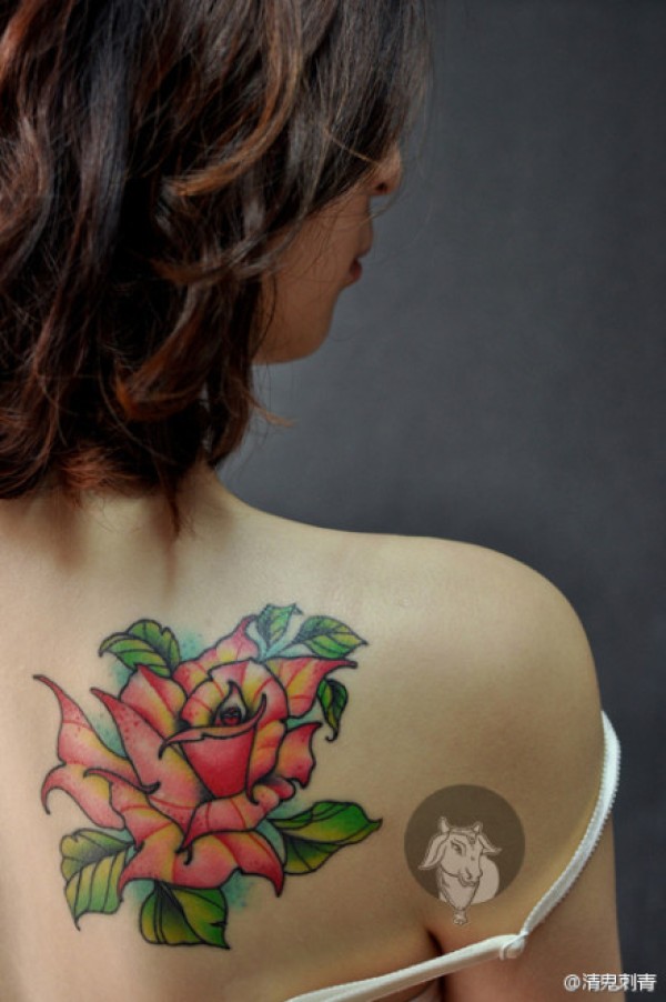 美女肩膀颜色艳丽的彩色玫瑰花纹身图案_玫瑰花纹身图案大全_纹身图吧