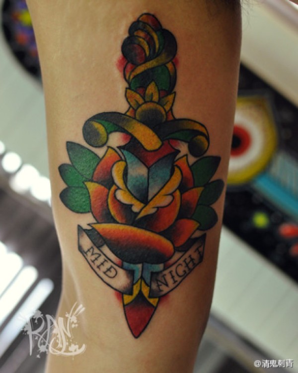 手臂内侧漂亮时尚的new school匕首玫瑰花纹身图案_玫瑰花纹身图案大全_纹身图吧