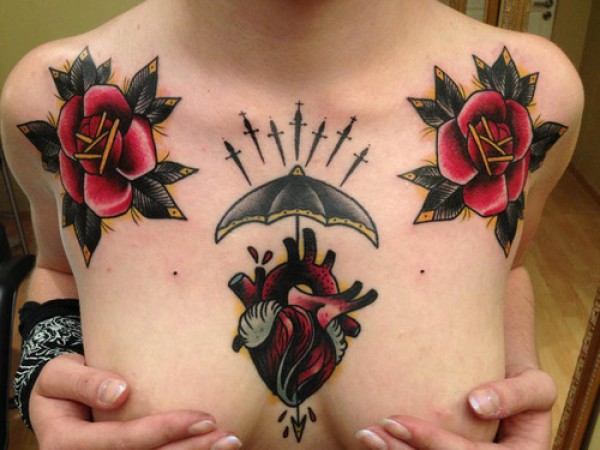 女生前胸漂亮时尚的心脏与玫瑰花纹身图案_玫瑰花纹身图案大全_纹身图吧