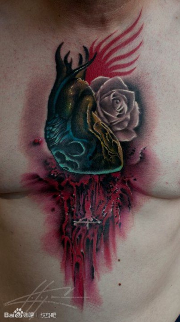前胸超酷的心脏与玫瑰花纹身图案_玫瑰花纹身图案大全_纹身图吧