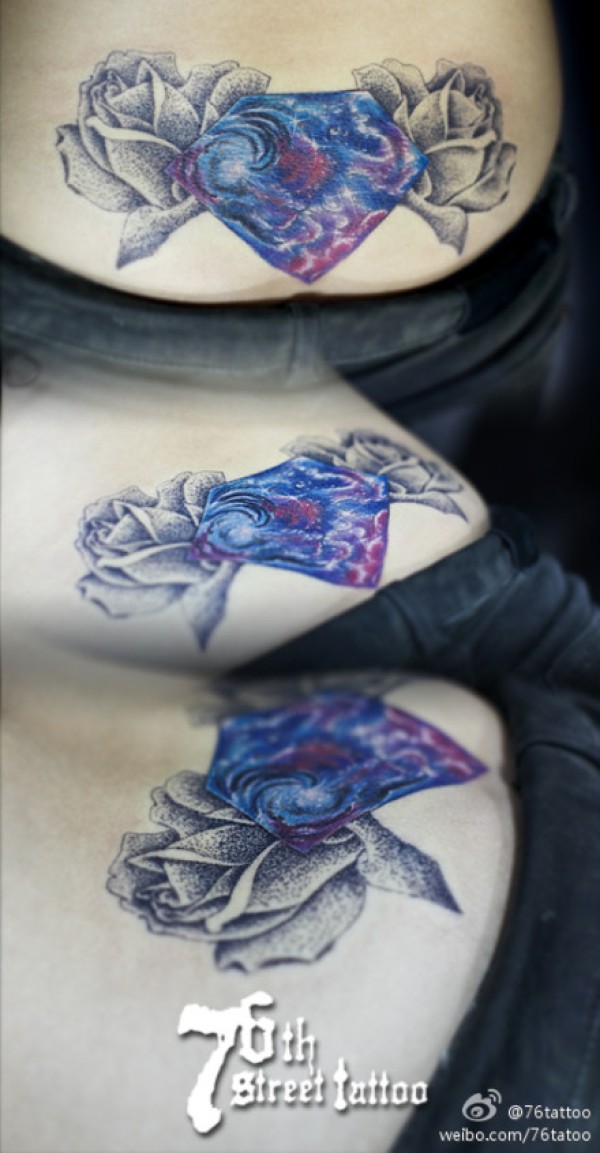 美女腰部超炫的星空钻石与玫瑰花纹身图案_玫瑰花纹身图案大全_纹身图吧