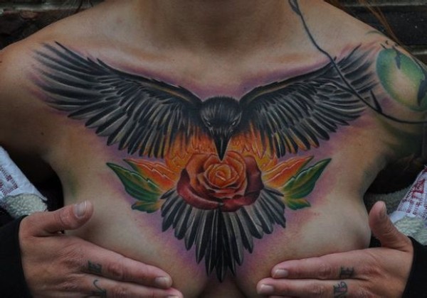 女生前胸超酷的乌鸦与玫瑰花纹身图案_玫瑰花纹身图案大全_纹身图吧