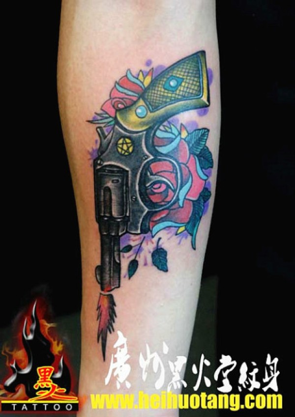 手臂超酷流行的手枪与玫瑰花纹身图案_玫瑰花纹身图案大全_纹身图吧