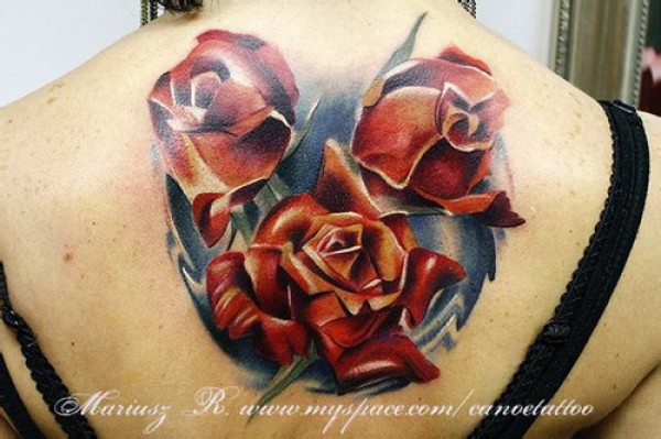 女生背部经典的欧美彩色玫瑰花纹身图案_玫瑰花纹身图案大全_纹身图吧