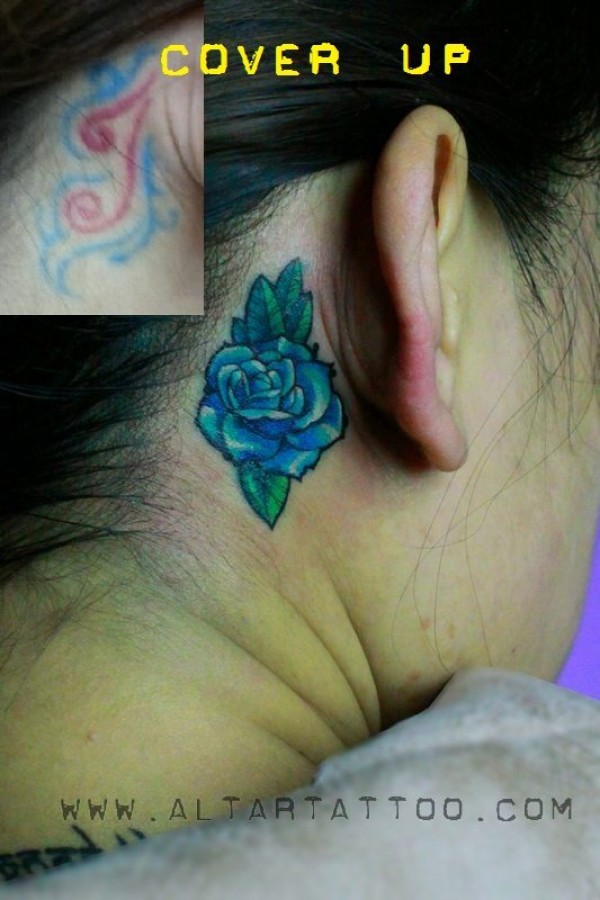耳后蓝色妖姬玫瑰纹身_玫瑰花纹身图案大全_纹身图吧