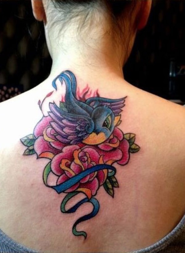 女生背部时尚漂亮的小燕子与玫瑰花纹身图案_玫瑰花纹身图案大全_纹身图吧