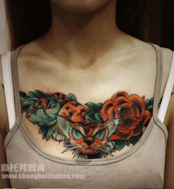 女生胸前好看的猫咪与玫瑰花纹身图案_玫瑰花纹身图案大全_纹身图吧