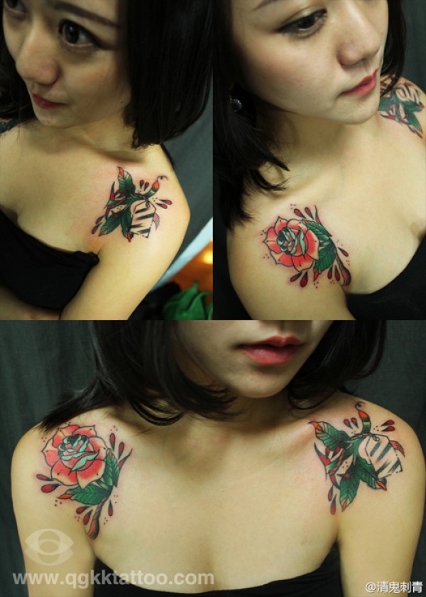 女生肩膀处漂亮的玫瑰花纹身图案_玫瑰花纹身图案大全_纹身图吧
