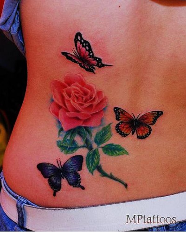 福建纹身店腰部玫瑰蝴蝶纹身图案图片_玫瑰花纹身图案大全_纹身图吧