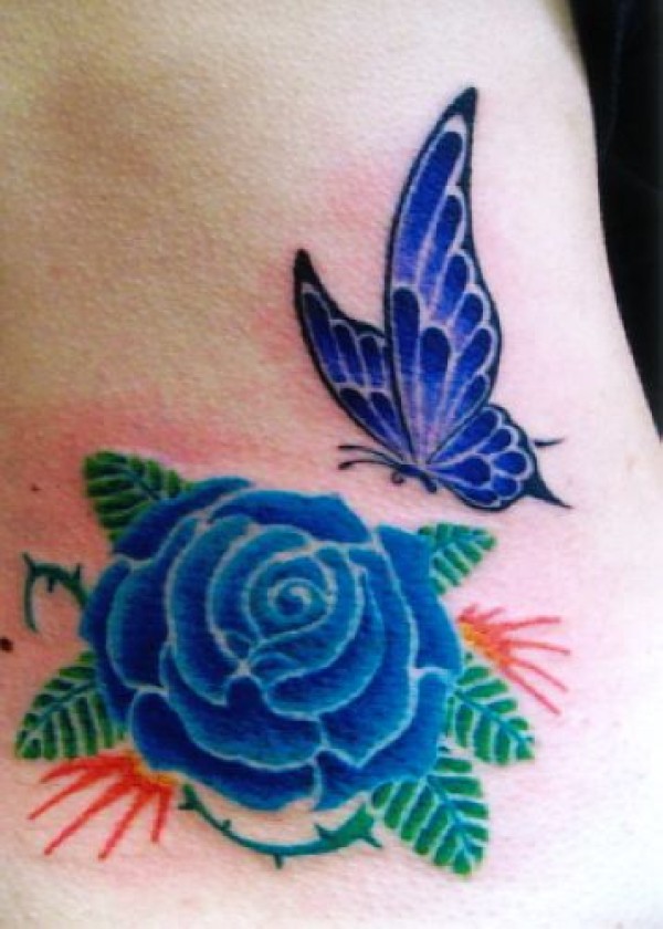 武汉专业文身店腰部玫瑰蝴蝶文身图案图片_玫瑰花纹身图案大全_纹身图吧