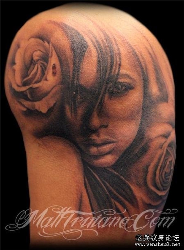 一款大臂欧美美女玫瑰花纹身图案纹身图片_玫瑰花纹身图案大全_纹身图吧