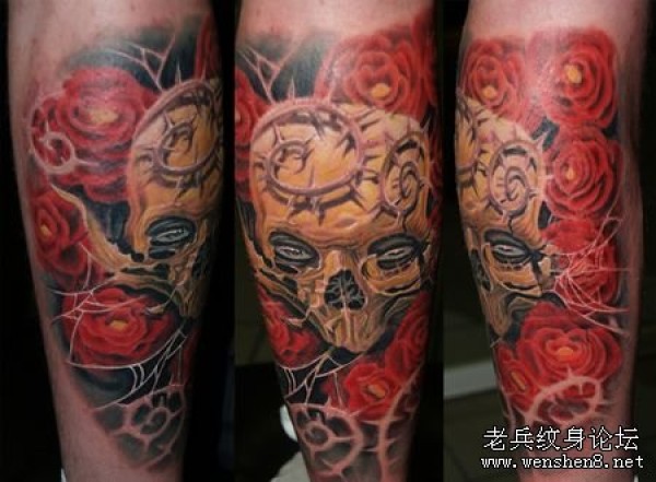 一款腿部欧美彩色骷髅玫瑰花纹身图案纹身图片_玫瑰花纹身图案大全_纹身图吧