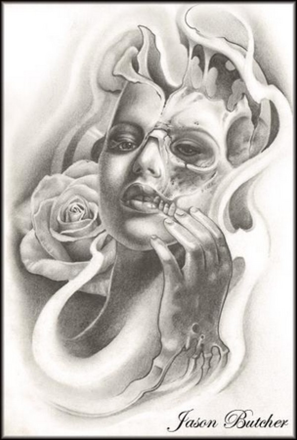 一款另类欧美美女骷髅玫瑰纹身图案纹身图片_玫瑰花纹身图案大全_纹身图吧