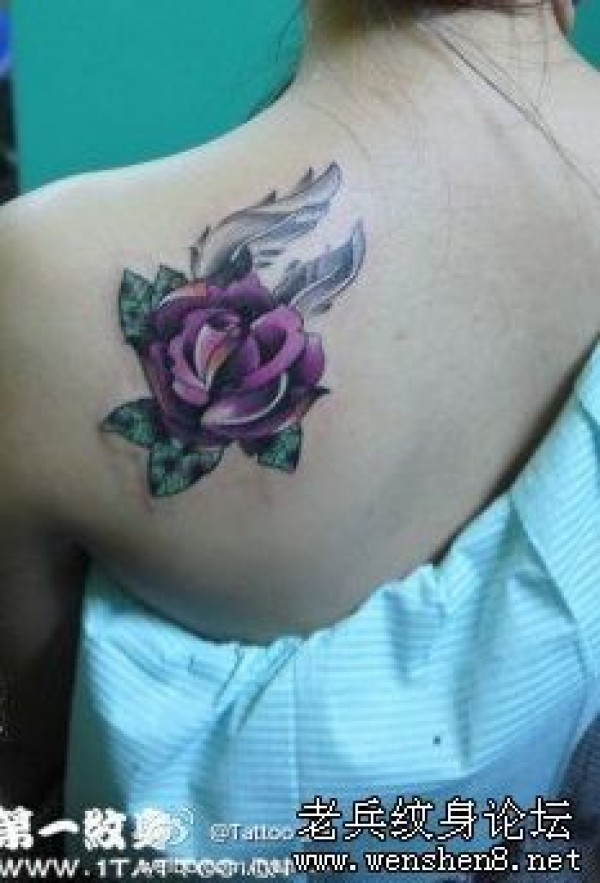 肩部彩色玫瑰纹身图案纹身图片_玫瑰花纹身图案大全_纹身图吧