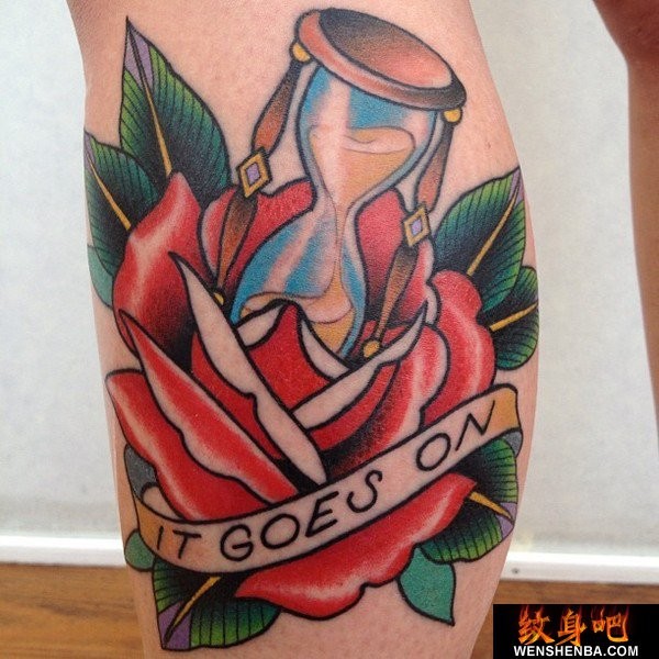 小腿玫瑰沙漏纹身_玫瑰花纹身图案大全_纹身图吧