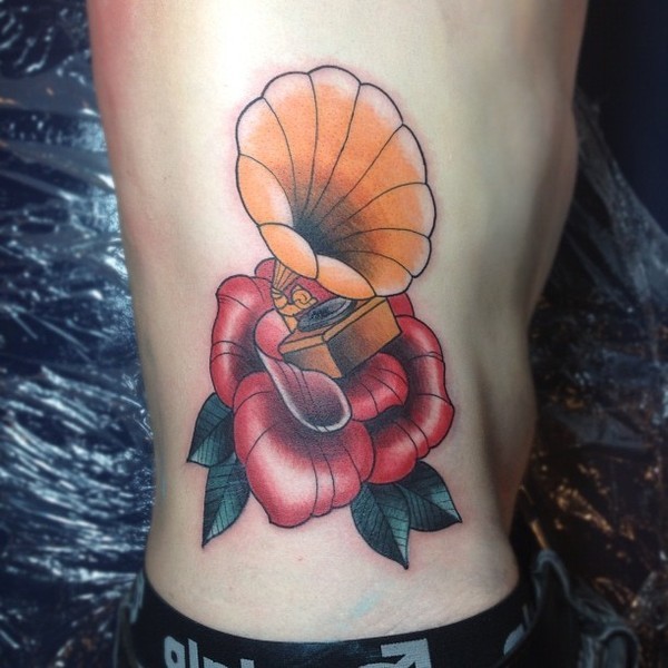 腰部玫瑰留声机_玫瑰花纹身图案大全_纹身图吧