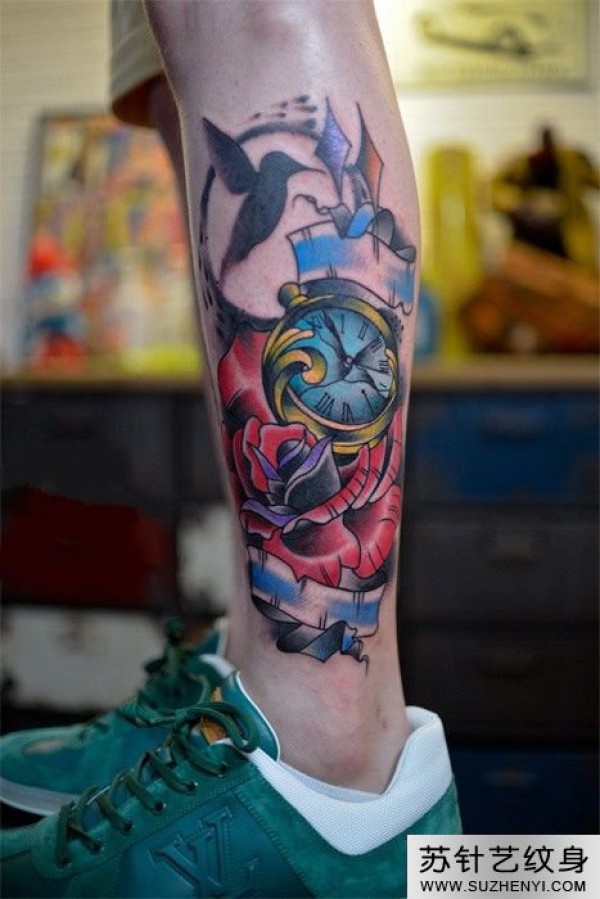 小腿玫瑰与时间纹身_玫瑰花纹身图案大全_纹身图吧