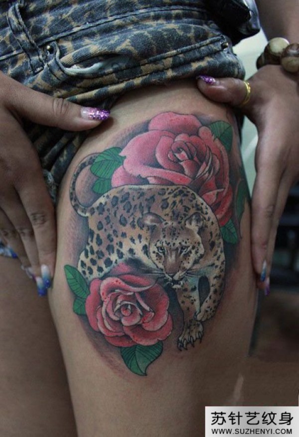 豹子玫瑰大腿纹身_玫瑰花纹身图案大全_纹身图吧