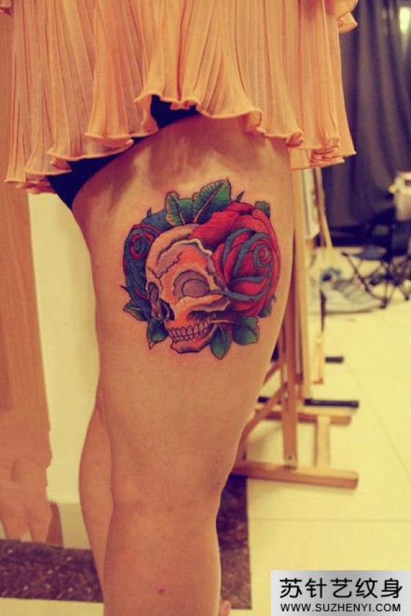 玫瑰骷髅时尚大腿纹身_玫瑰花纹身图案大全_纹身图吧