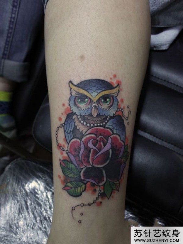 玫瑰猫头鹰个性纹身_玫瑰花纹身图案大全_纹身图吧