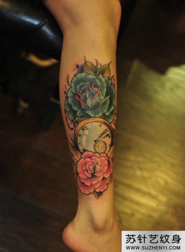 玫瑰时钟腿部纹身_玫瑰花纹身图案大全_纹身图吧