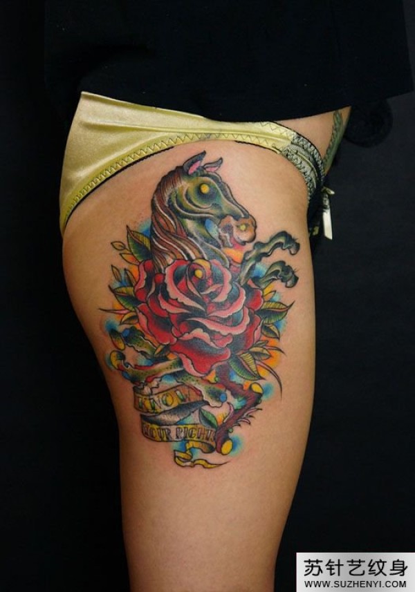 彩绘马与玫瑰大腿纹身_玫瑰花纹身图案大全_纹身图吧