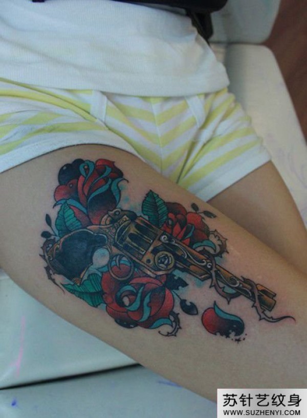 玫瑰手枪大腿纹身_玫瑰花纹身图案大全_纹身图吧