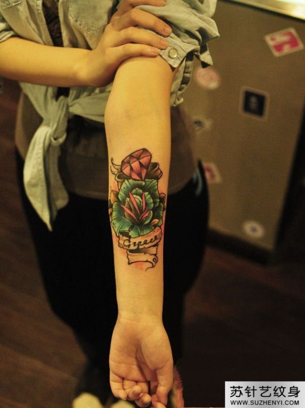 彩色玫瑰钻石手臂纹身_玫瑰花纹身图案大全_纹身图吧