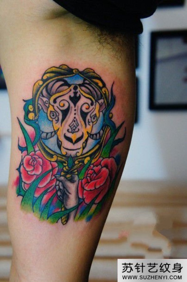 大臂羊头玫瑰纹身_玫瑰花纹身图案大全_纹身图吧