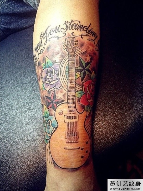 玫瑰吉他个性手臂纹身_玫瑰花纹身图案大全_纹身图吧