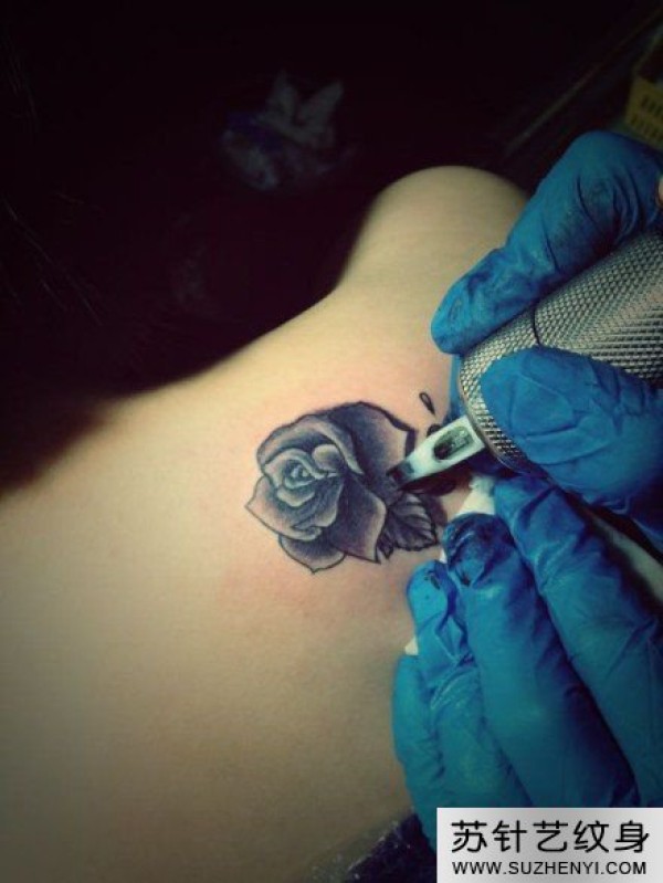 女生个性后颈黑白玫瑰唯美纹身_玫瑰花纹身图案大全_纹身图吧
