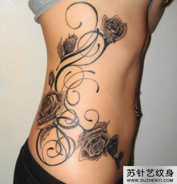 侧腰黑色玫瑰纹身图_玫瑰花纹身图案大全_纹身图吧