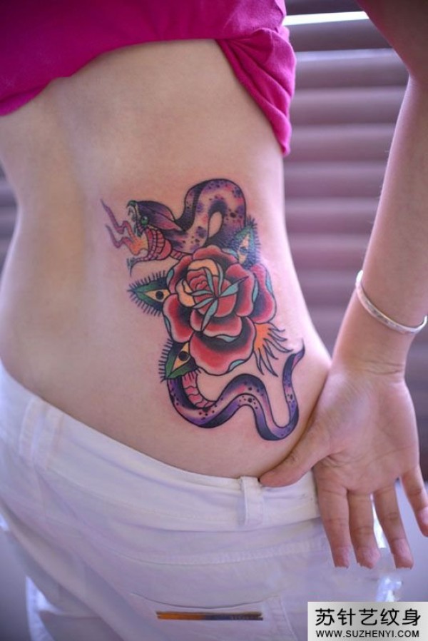 蛇与玫瑰腰部纹身_玫瑰花纹身图案大全_纹身图吧