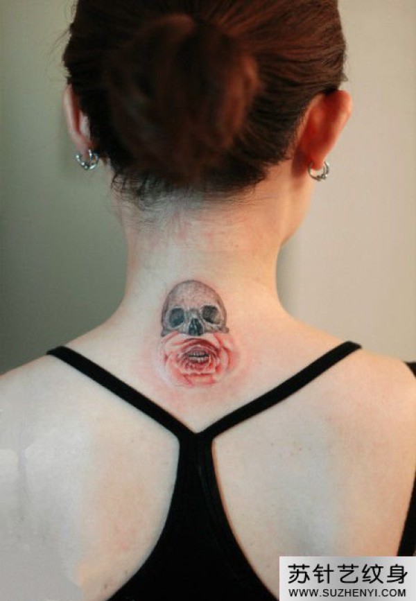 最新骷髅玫瑰后颈纹身_玫瑰花纹身图案大全_纹身图吧