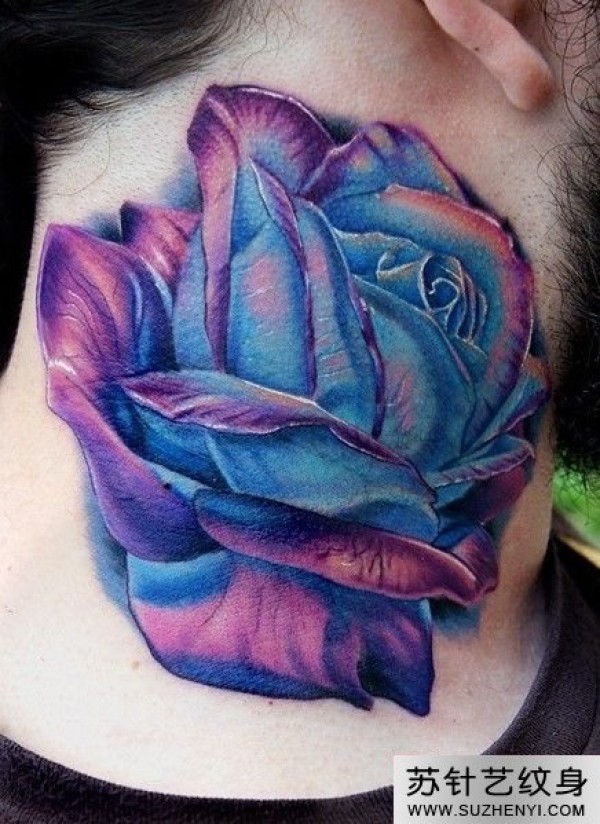 耳后蓝色妖姬玫瑰纹身_玫瑰花纹身图案大全_纹身图吧