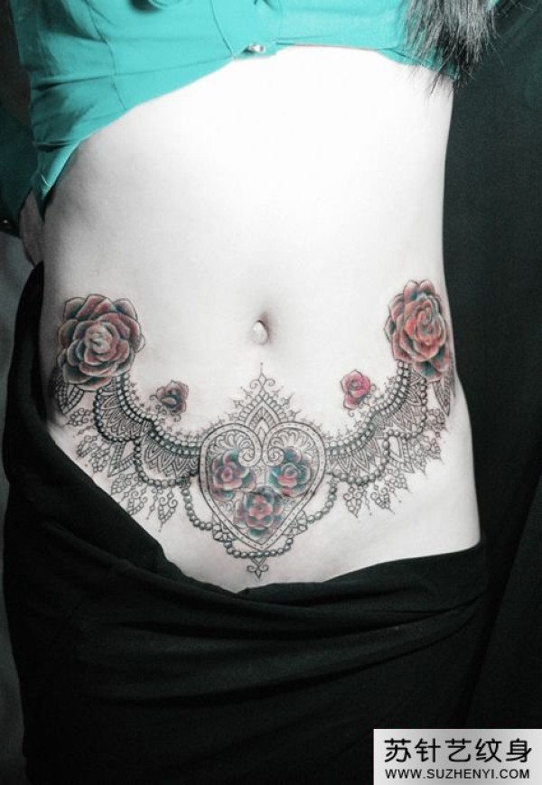 性感蕾丝玫瑰腹部纹身_玫瑰花纹身图案大全_纹身图吧