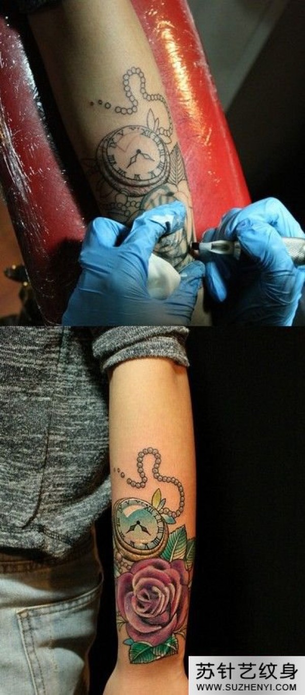 玫瑰怀表手臂纹身_玫瑰花纹身图案大全_纹身图吧