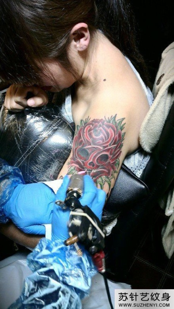 女生手臂玫瑰骷髅纹身_玫瑰花纹身图案大全_纹身图吧