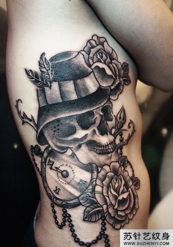 霸气骷髅怀表玫瑰纹身_玫瑰花纹身图案大全_纹身图吧