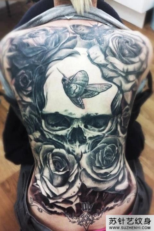 女人满背玫瑰骷髅头纹身图_玫瑰花纹身图案大全_纹身图吧