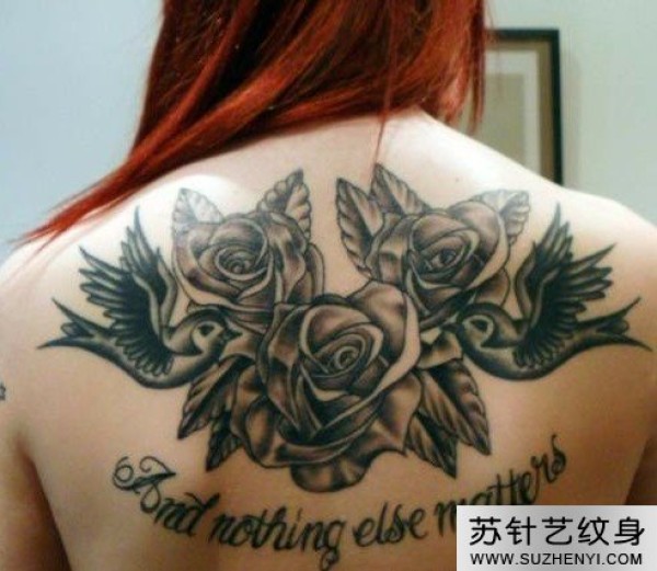 满背黑色玫瑰和燕子纹身图案_玫瑰花纹身图案大全_纹身图吧