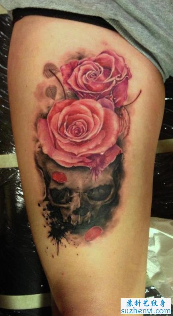 女人腿部骷髅与玫瑰花纹身图案_玫瑰花纹身图案大全_纹身图吧