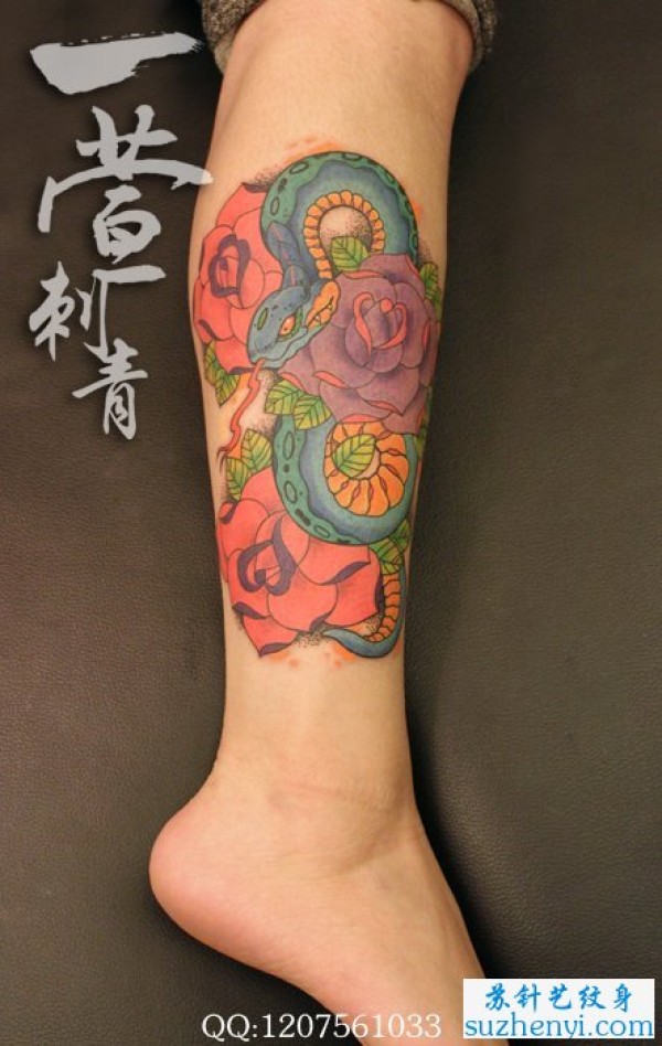 漂亮的彩色蛇与玫瑰花纹身图案_玫瑰花纹身图案大全_纹身图吧