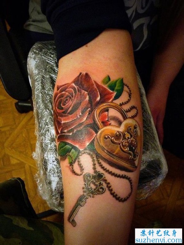 唯美的彩色玫瑰花与爱心锁纹身_玫瑰花纹身图案大全_纹身图吧