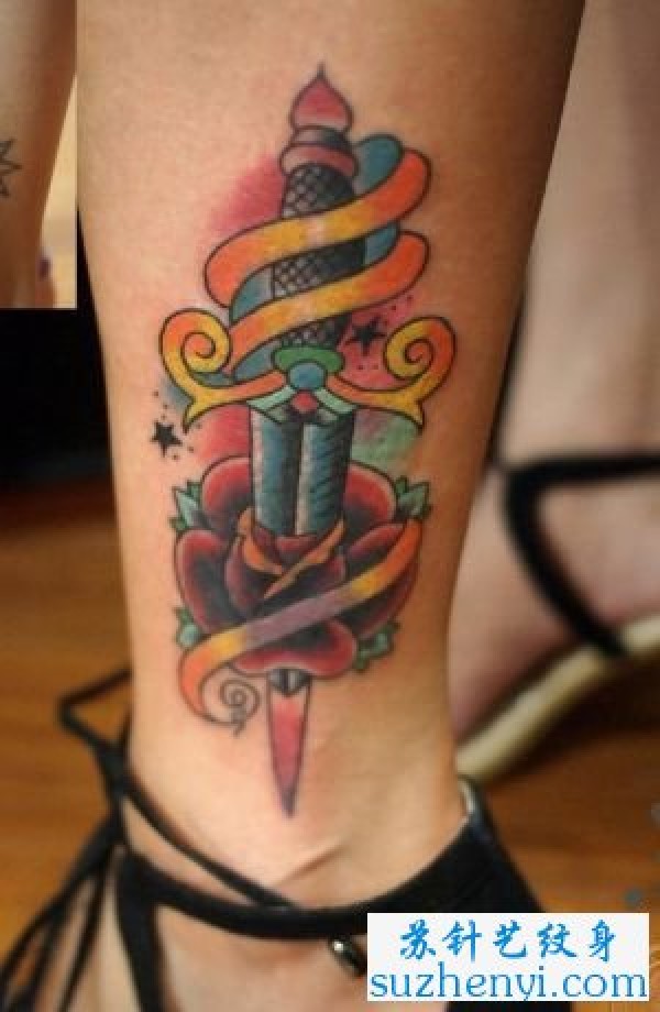 艳丽匕首与玫瑰花纹身_玫瑰花纹身图案大全_纹身图吧